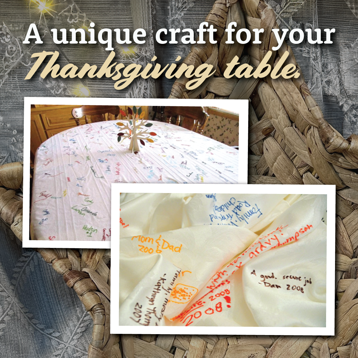 The idea is to simply visit your local Goodwill or dig through your own linen closet and find a tablecloth, runner or even a plain white flat sheet. Put it on your table for Thanksgiving and invite each dinner guest to write what they’re thankful for, sign their name, write a message, trace their handprint or draw a little doodle to remember them by. Then, each year, you can bring it out again and again to add more and more, like a blank canvas for holiday memories that you can hold onto forever and cherish alongside guests past and present.